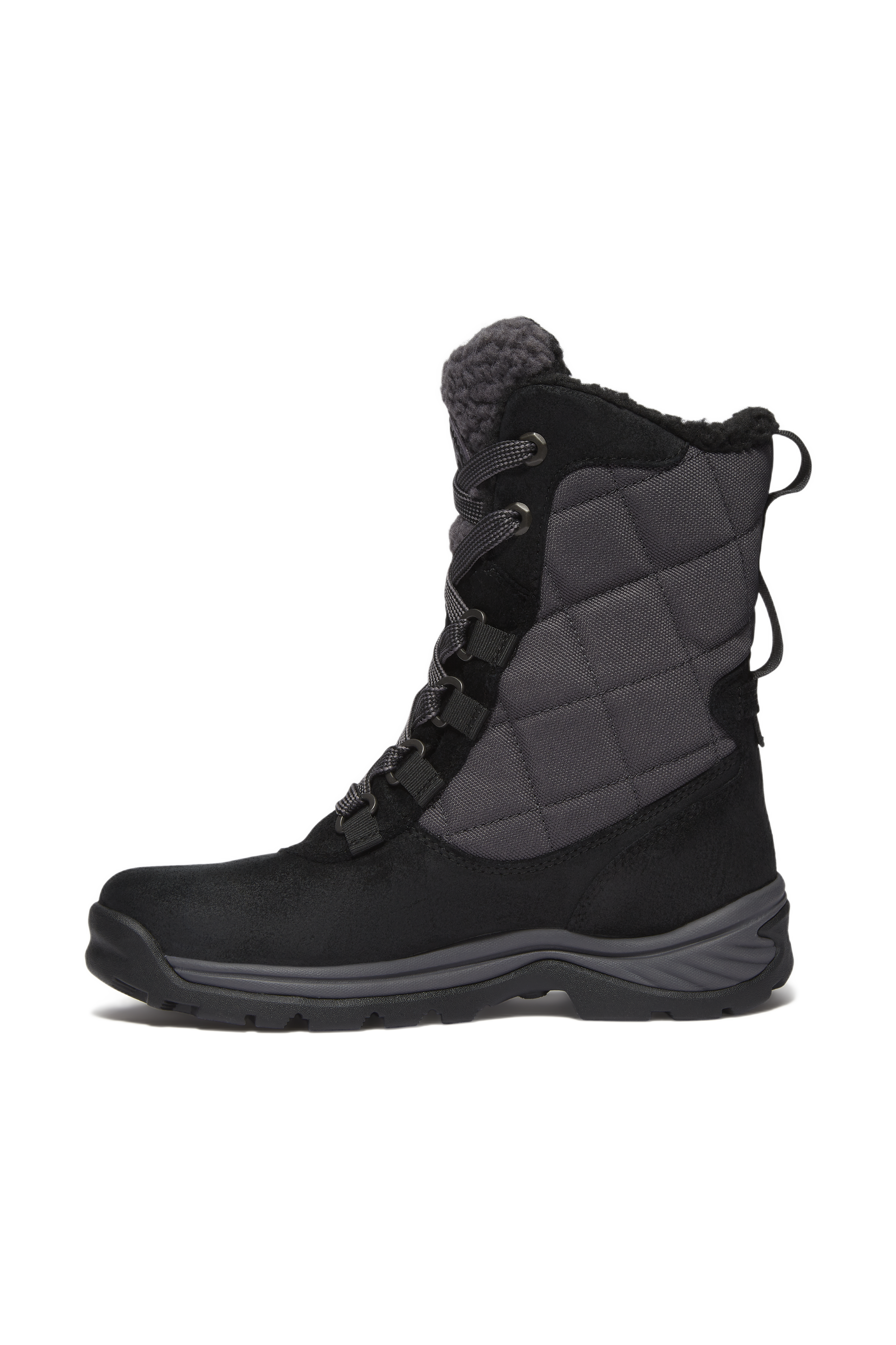 Waterproof premium leather upper with a faux shearling collar lining.