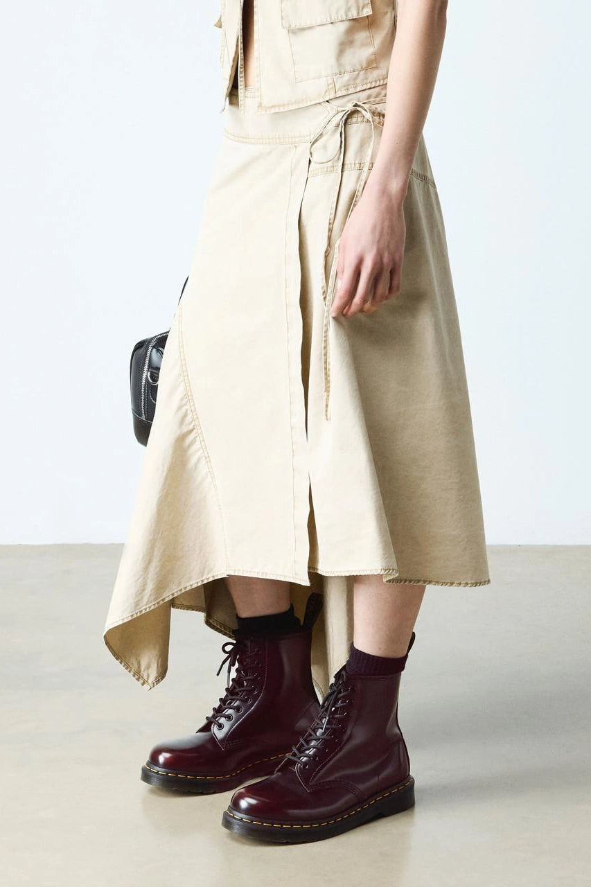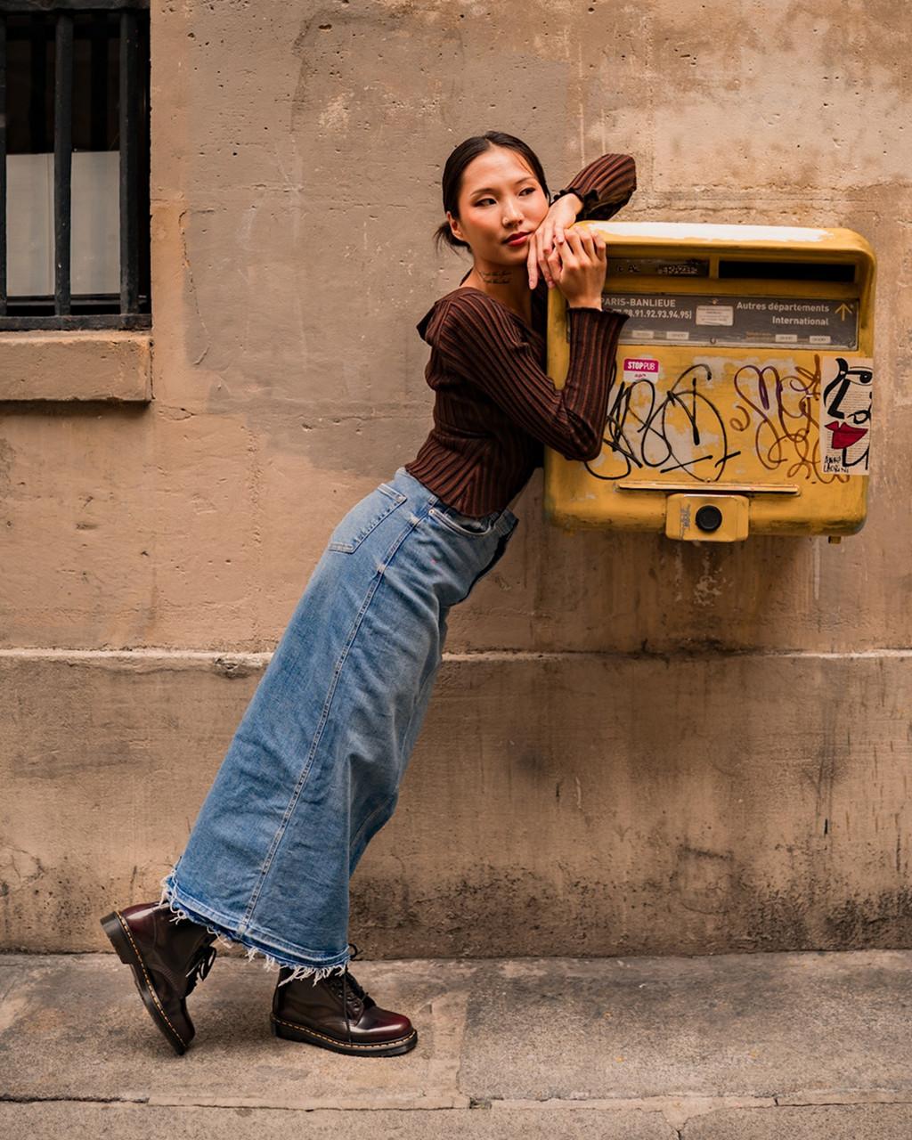 Complement with a structured midi skirt and a utility vest for a modern, fashion-forward ensemble.